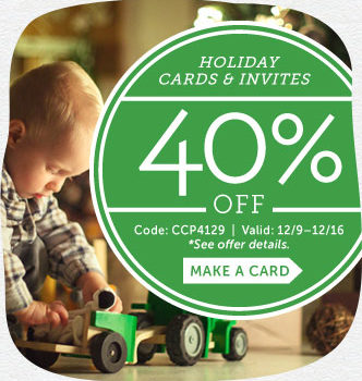 Save 40% off all Holiday Cards & Invites at Cardstore! Just use the code CCP4129 by 12.16.14. continue Reading...