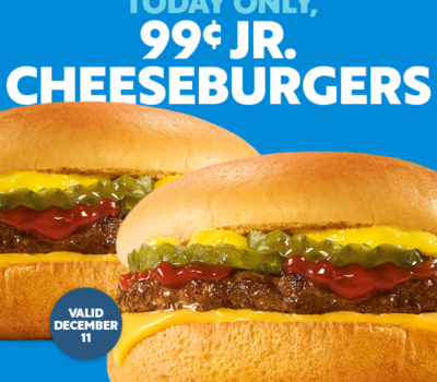 Today only, December 11th, hurry on over to Sonic where you can get $0.99 Jr. Cheeseburgers! This continue Reading...