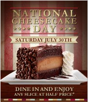 Who knew?!! It’s National Cheesecake Day! If you have a Cheesecake Factory near you, head over and get a slice of cheesecake for half price! You do have to dine-in to receive this offer, but you don’t have to purchase anything else.