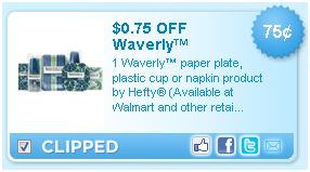 I just noticed a new coupon to save on Waverly products! Print a 75¢/1 Hefty Waverly Paper Plate, Cup, or Napkin at Coupons.com.