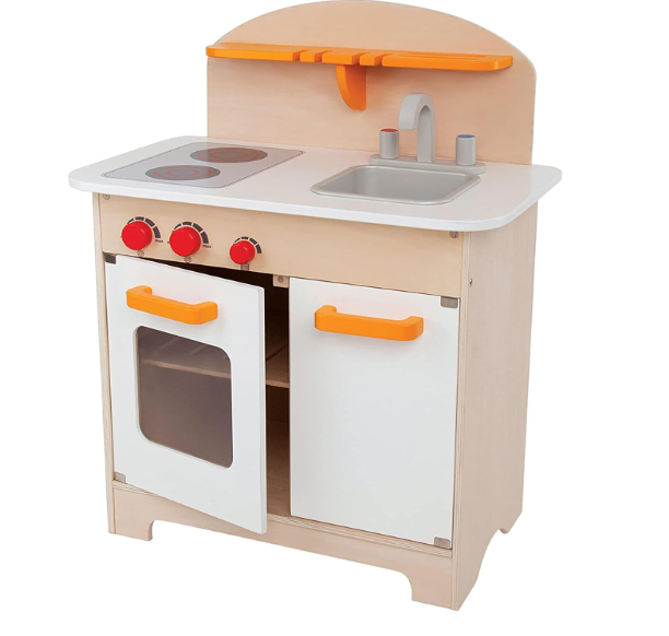 This wooden play kitchen comes with a sink, an oven, a spice shelf, clickable knobs, and more. Plus, it’s made of durable wood and non-toxic, water-based paint. Please remember that prices may change.
