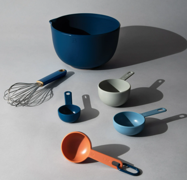 This set comes with a mixing bowl, whisk, and four measuring cups. Please remember that prices may change.