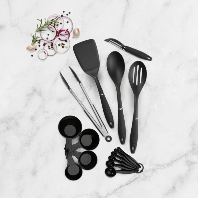 This set includes a solid spoon, slotted spoon, solid turner, peeler, 4pc measuring cup set, 6pc measuring spoon set, and 12″ nylon-tipped tongs. These utensils have a soft grip, nonslip ergonomic handle, and they are all dishwasher safe! Please remember that prices may change.