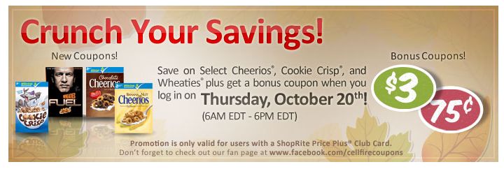 If you’re a ShopRite shopper, you can head over to your Cellfire (an eCoupon site) today! Log-in to your account between 6 AM and 6 PM (EST) to receive either a 75¢ or $3 eCoupon! Make sure to clip the coupon in order to add them to your account. These bonus coupons expire Saturday, October 22.