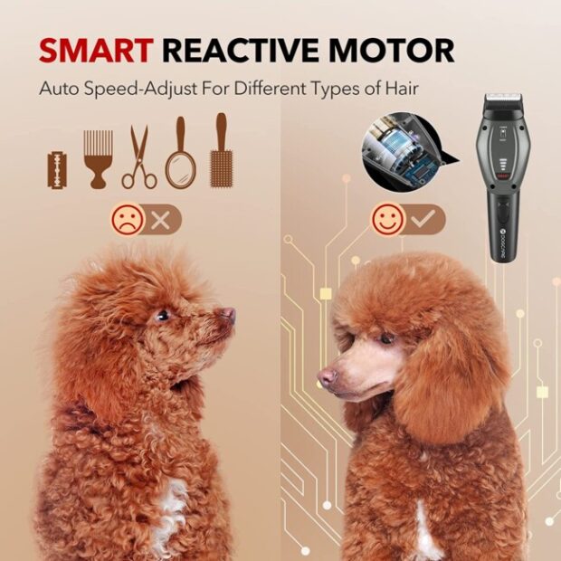 - 【User-friendly smart mode】Do you worry that you cannot groom your pets smoothly without superb skills and proficiency for home pet grooming? Equipped with powerful algorithm, DOG CARE dog clippers’ smart mode intelligently senses the level and thickness of hair, and automatically adjusts to the optimal clipping speed. No skill is required, just click on the ‘SMART’ button and let DOG CARE dog grooming kit do the rest of the job. Home grooming has never been this easy.