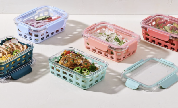 This set comes with five glass food containers and five BPA-free plastic locking lids that keep your food fresh. Please remember that prices may change.