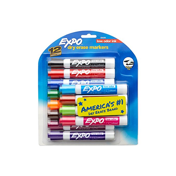 - Expo Low-Odor Dry Erase Markers, Chisel Tip, 12-Pack, Assorted Colors (80699)