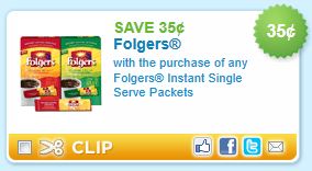 There are two new Folgers coupons: Save 35¢/1 Folgers Instant Single Serve Packets and $1/1 Folgers Filter Packs.
