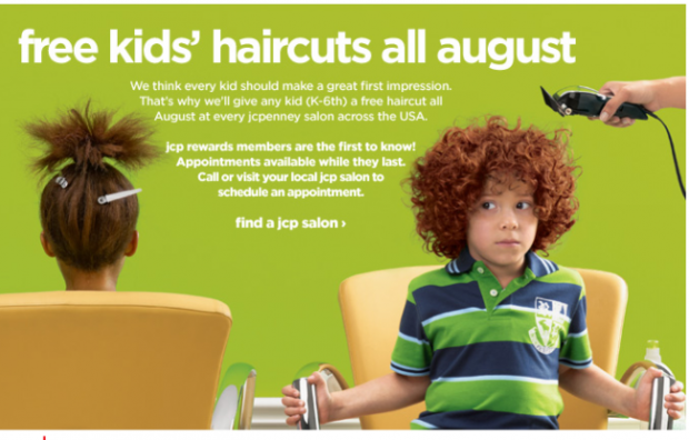 During August, JCPenney’s will be offering hair cuts to all K-6th grade students for free. This offer is available by appointment only. You’ll probably want to book an appointment now if you are interested in this!
