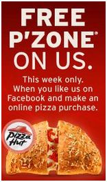 Another restaurant deal! “Like” Pizza Hut on Facebook to get a code for a FREE P’Zone when you make an online pizza purchase. This offer is valid through August 21, 2011. Click on the “Get Your P’Zone” tab on the left-hand side to find it!