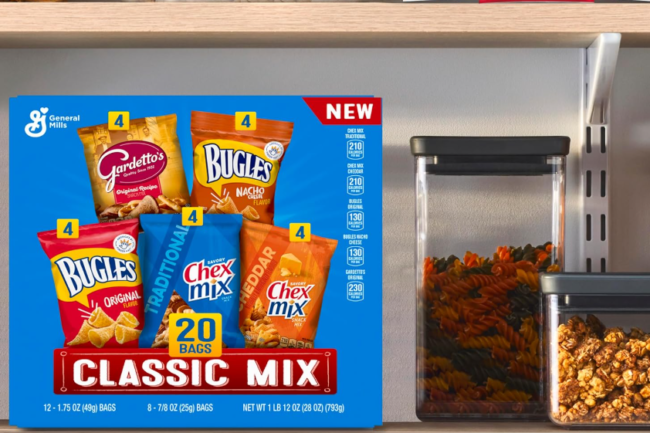 This variety pack comes with Original and Nacho Cheese Bugles, Traditional and Cheddar Chex Mix, and Original Gardetto’s. Please remember that prices may change.