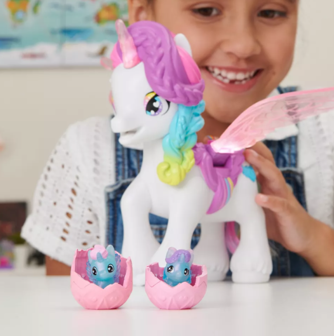 With flapping wings, over 60 different lights, sounds, and reactions, your kiddo will spend hours playing with this glittery unicorn! She comes with a comb for her rainbow tail, two exclusive Twin Babies, and a basket for the babies to ride in. Please remember that prices may change.