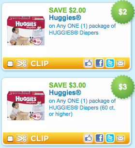 Head over to Coupons.com to find a new $2/1 Huggies Diapers. This is a high value coupon good for any size package! There is also a $3/1 Huggies Diapers (60-count package or higher).