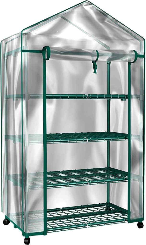 This mini greenhouse has four shelves that can each hold up to 24 pounds, a clear PVC cover with a zippered roll-up door, and wheels for easy transportation. Please remember that prices may change.