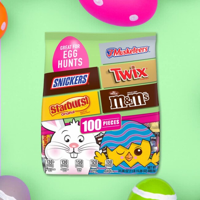 Get a headstart on buying your Easter candy! Hop on over to either Amazon or Walmart.com where you can get this 100-piece bag of Mars Easter Candy for just $10.98. This giant bag includes all your favorites- M&M’s, Snickers, Starburst, Twix, and 3 Musketeers! Please remember that prices may change.