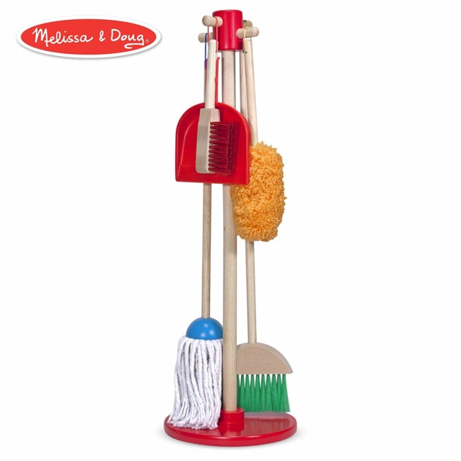 - REALISTIC WOODEN CLEANING TOYS: This colorful, kid-sized set looks just like the real thing and includes a wooden pretend play broom, mop, duster, brush, and organizing stand. The red dustpan conveniently clips into all handles