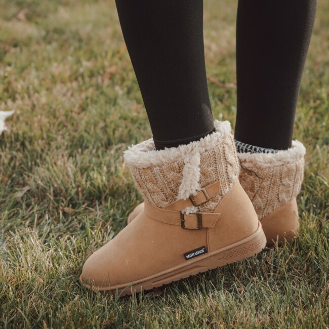 Stroll through chilly days in style with MUK LUKS® Alyx Boots! These cute ankle booties surround feet with softness while a durable sole keeps you dry and warm. Chic faux suede in wear-everywhere neutral colors is complemented by sweet knit accents and trendy strap detail. Comfy, warm walks are in your future!