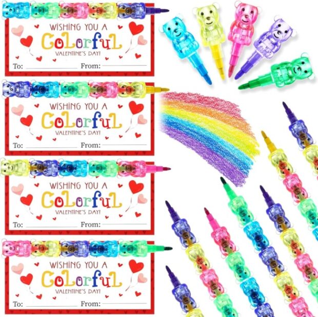 - Comprehensive Set: you will receive 24 pcs of 5 color stacking crayons and 24 Valentines greeting cards, a total of 48 pieces; At the same time, with 1 double sided adhesive dots (a total of 100), convenient to attach the gift card to the crayons, This ample quantity is suitable to satisfy both your personal use and gifting needs