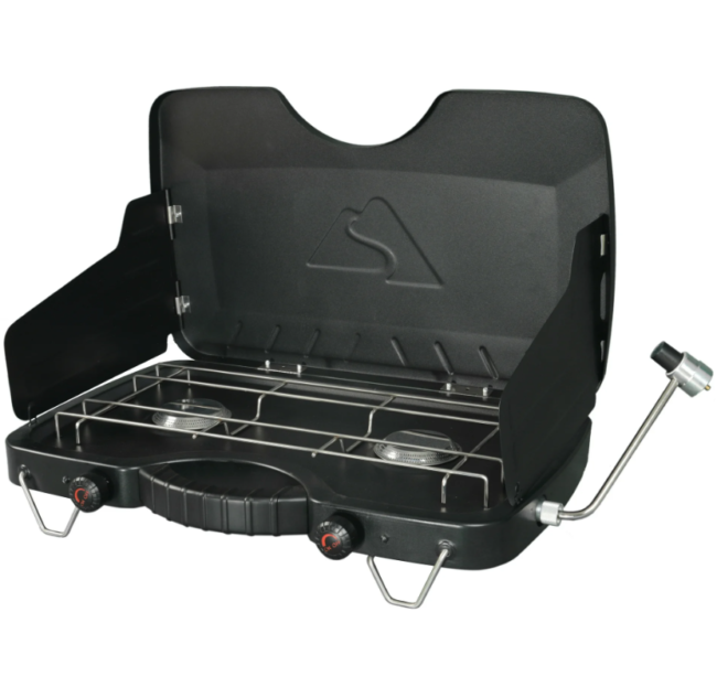 - Dual-burner propane stove is suitable for use when camping or without electricity