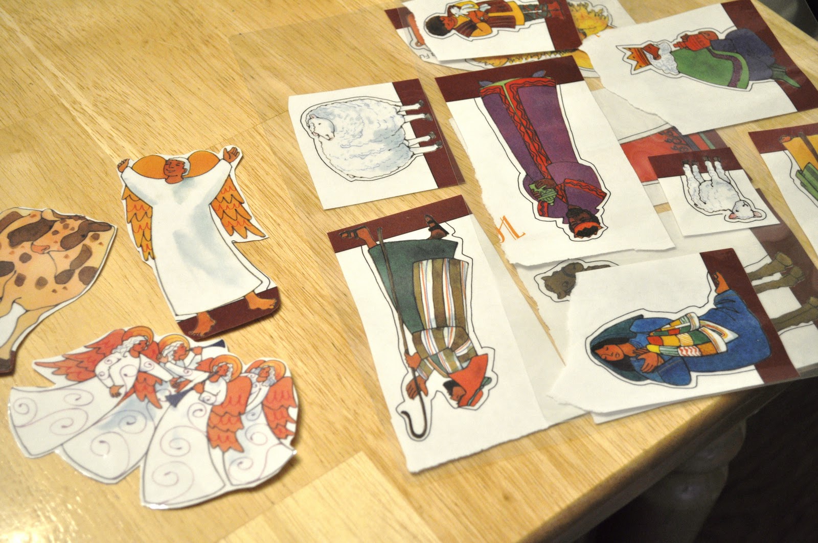 1) If you’re able to find cards with nativity scenes, cut out the various people and animals needed. If not, print a Nativity set on cardstock. You could even color your own!
