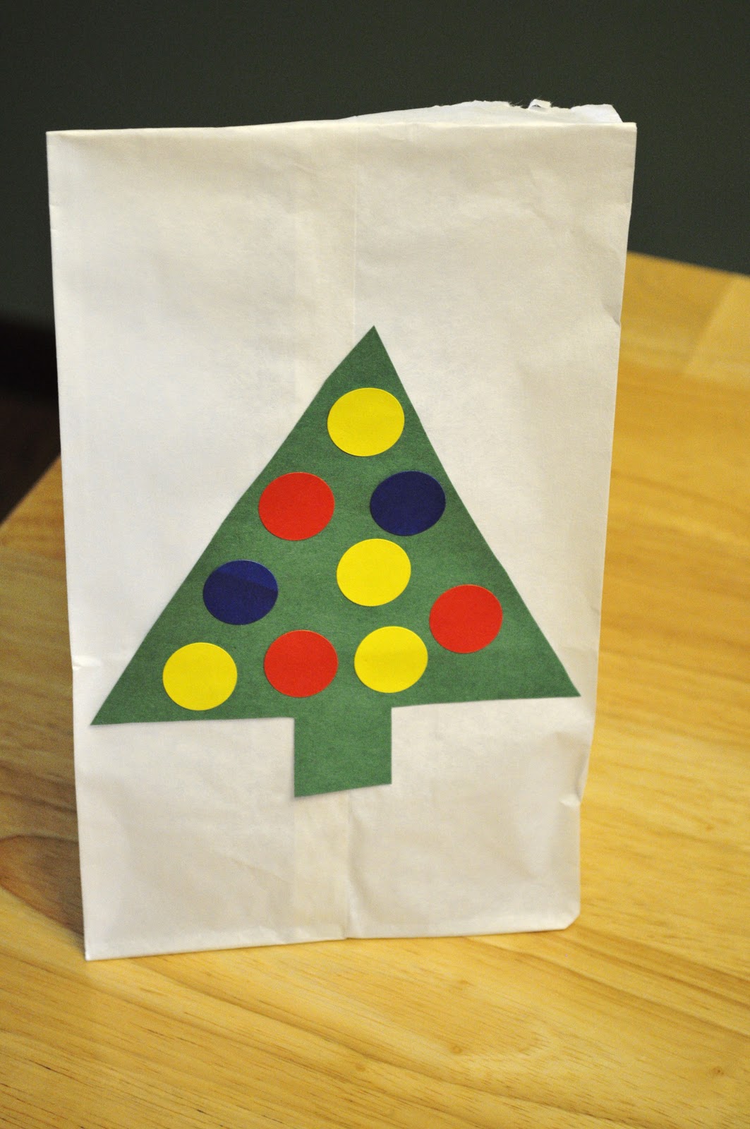 1) Draw and cut-out a Christmas tree shape. Glue to the paper sack.