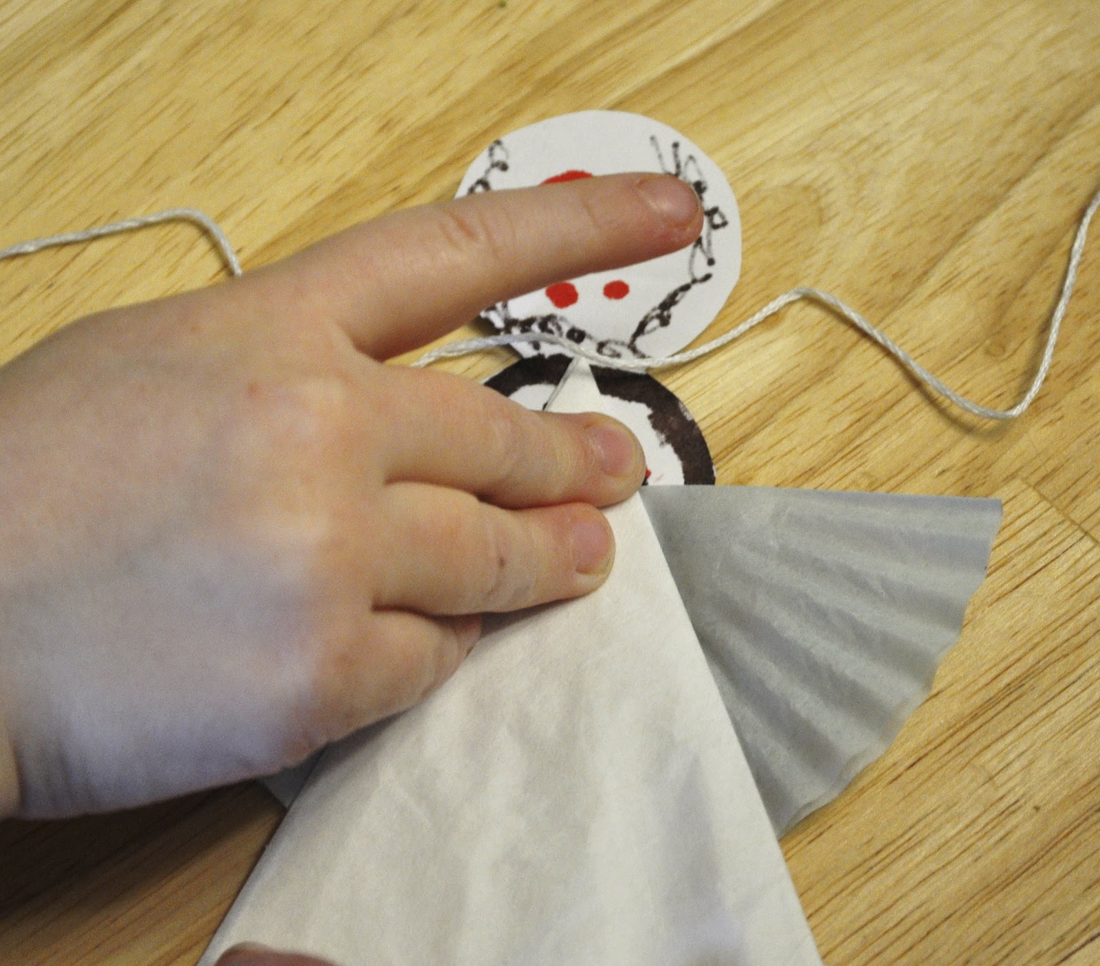 4) Draw a face on the circle. Glue the angel body on the circle. Place ribbon or string across the fold.