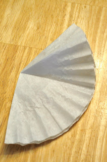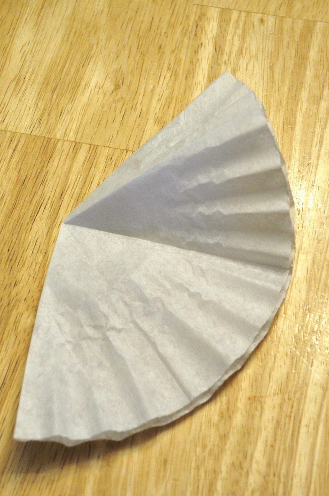 1) Fold a coffee filter in half. Cover the filter with glue and fold in half again. Glue again and fold in half once more.
