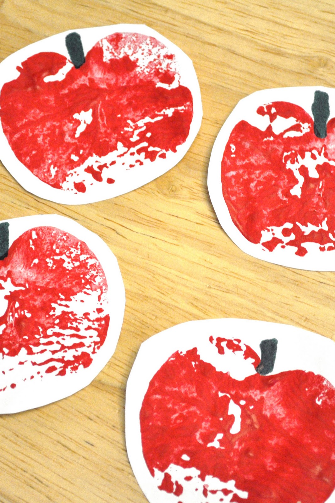 Your apple prints turned out great. Adding the stem really helps. Love how the picture of the apples on the floor on top of a head. 🙂
