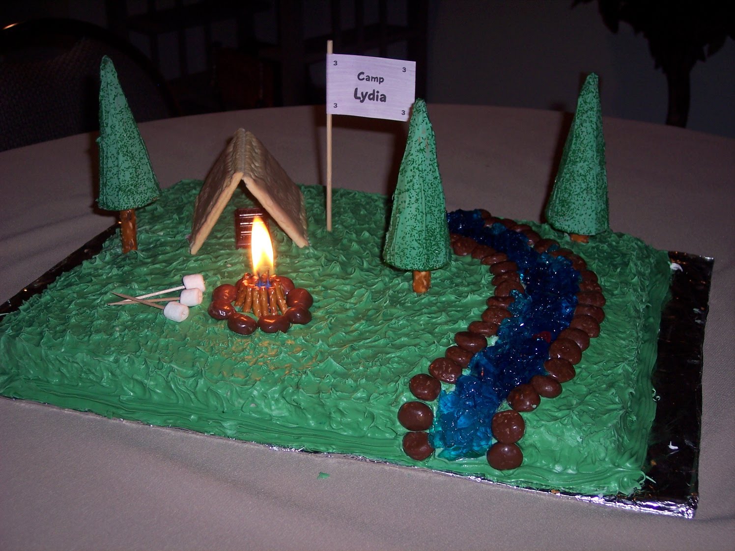 I added a campsite flag to the Campfire Cake as a finishing touch for the birthday girl!