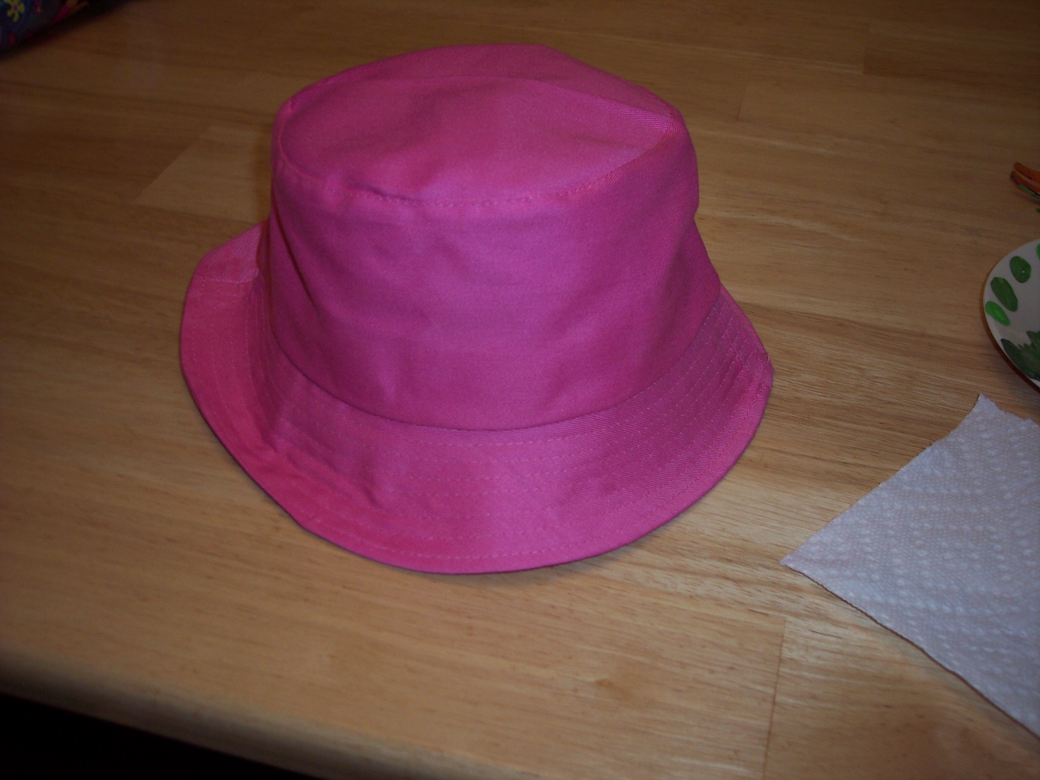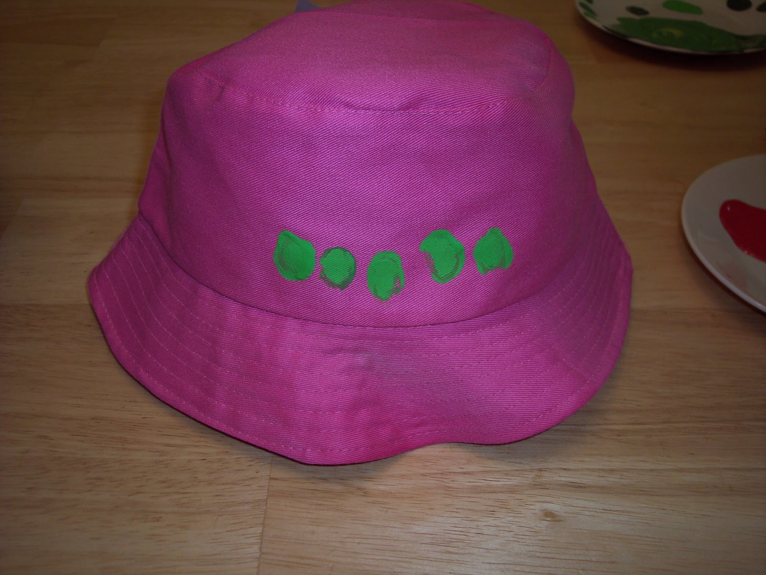 2) Have your child press a finger in the paint and push it on the hat. Check for paint on other parts of the hand and clean them off if necessary (we learned this the hard way and have a few stains on the hat to show for it!). Then add more fingerprints! If you find the bowl cumbersome, just lay the hat down flat to work on it. Make sure to have cardboard between the layers or your paint might soak through to the back of the hat.