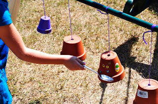2) Tie the pots to a rod of some sort. We used the swing set bar! You can also do this inside using a pocket chart stand, hanging stand, or something like that. Explore the sounds by using various objects to hit the pots (spoons, pens, sticks, etc.).