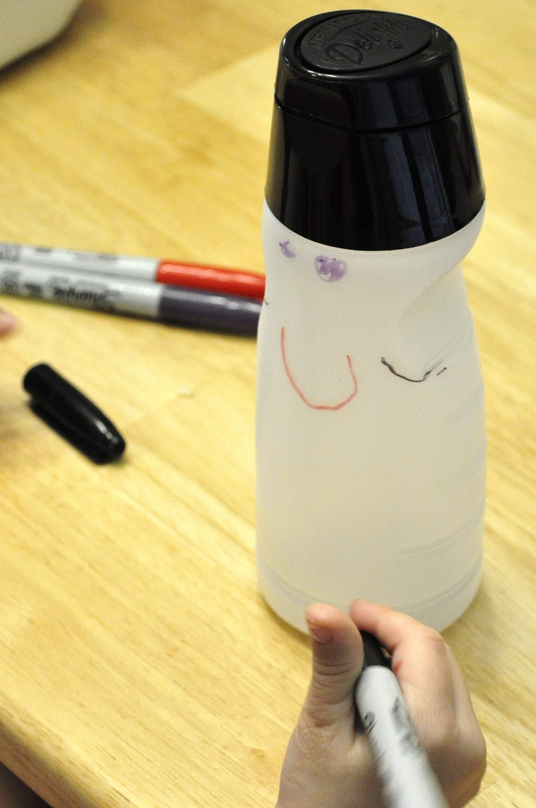 This morning, we attempted to make snowmen out of recycled coffee creamer containers!