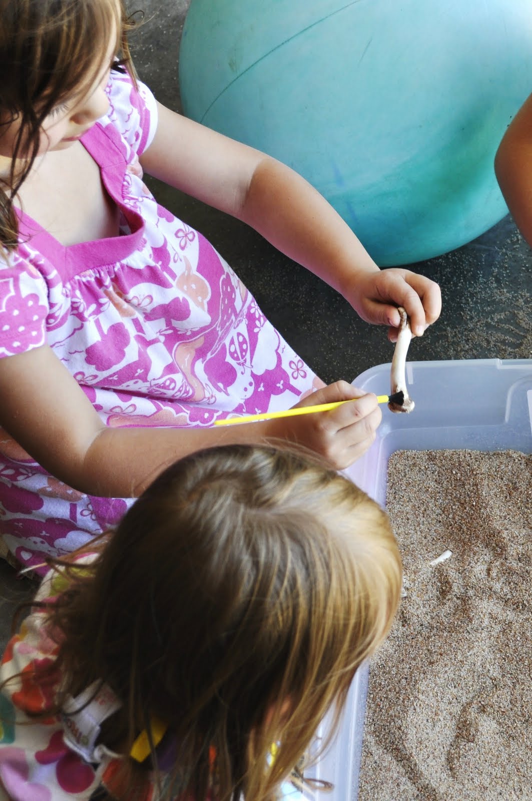 3) Bury the bones in the sand. “Excavate” the bones. Use tweezers for an extra boost in fine-motor development!