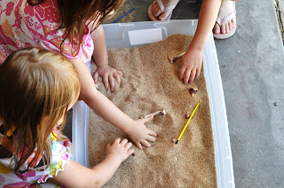 I worked with a Kindergarten teacher who did something similar in her sandbox…but she also buried one of those giant bones from the petstore that you would buy to give a large dog. It was pretty funny seeing the kids find THAT in the sandbox!