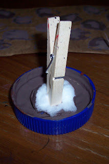 2) Cut a sponge into a small rectangle and clip with a clothespin to form a stamp. I didn’t have a sponge, so I improvised with a cotton ball. Since we weren’t doing too many stamps, it held up okay. I think a sponge would be preferable though.
