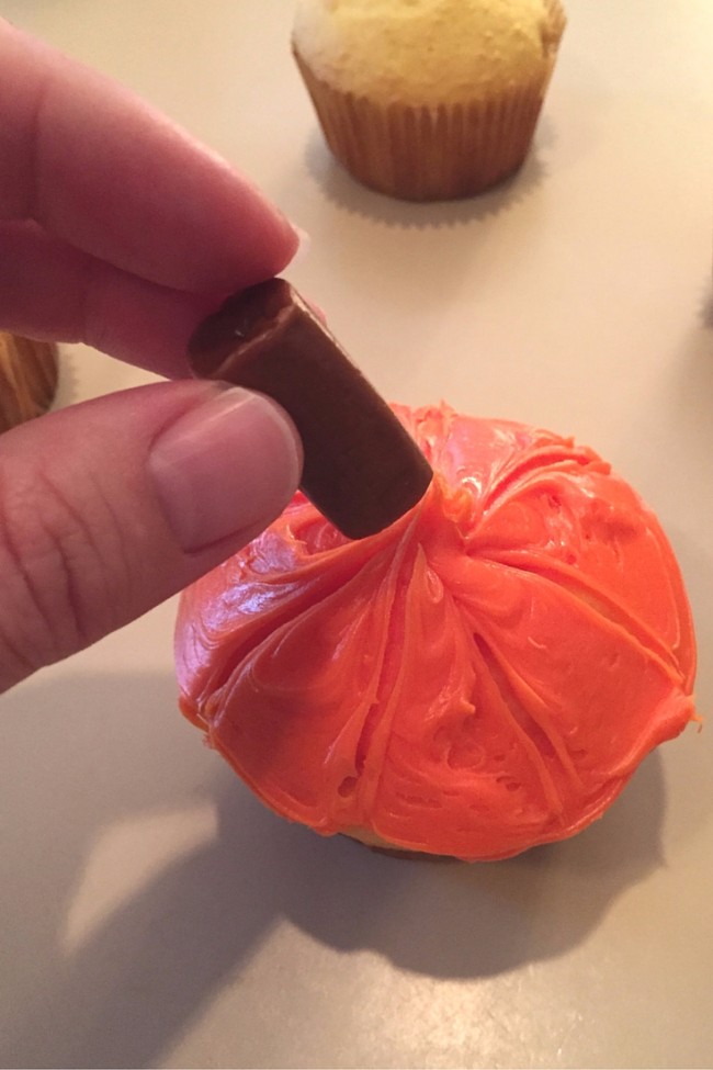 2. Frost the cupcakes with orange icing. (I usually love to make my own icing, but this icing was already orange and so very easy.)