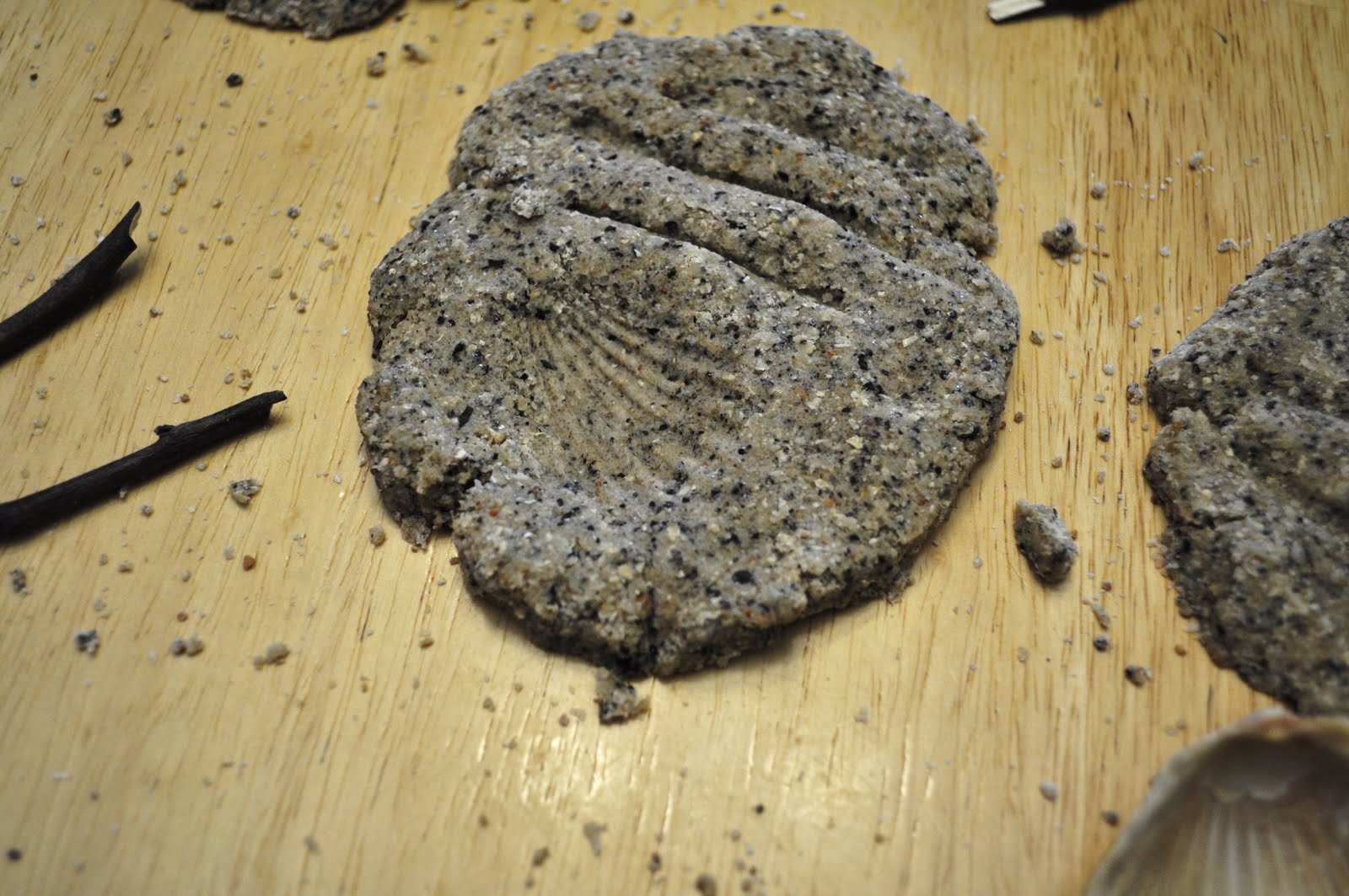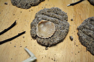 1) After making the “fossil” dough, roll it out. Make imprints with various objects (shells, sticks, etc.).
