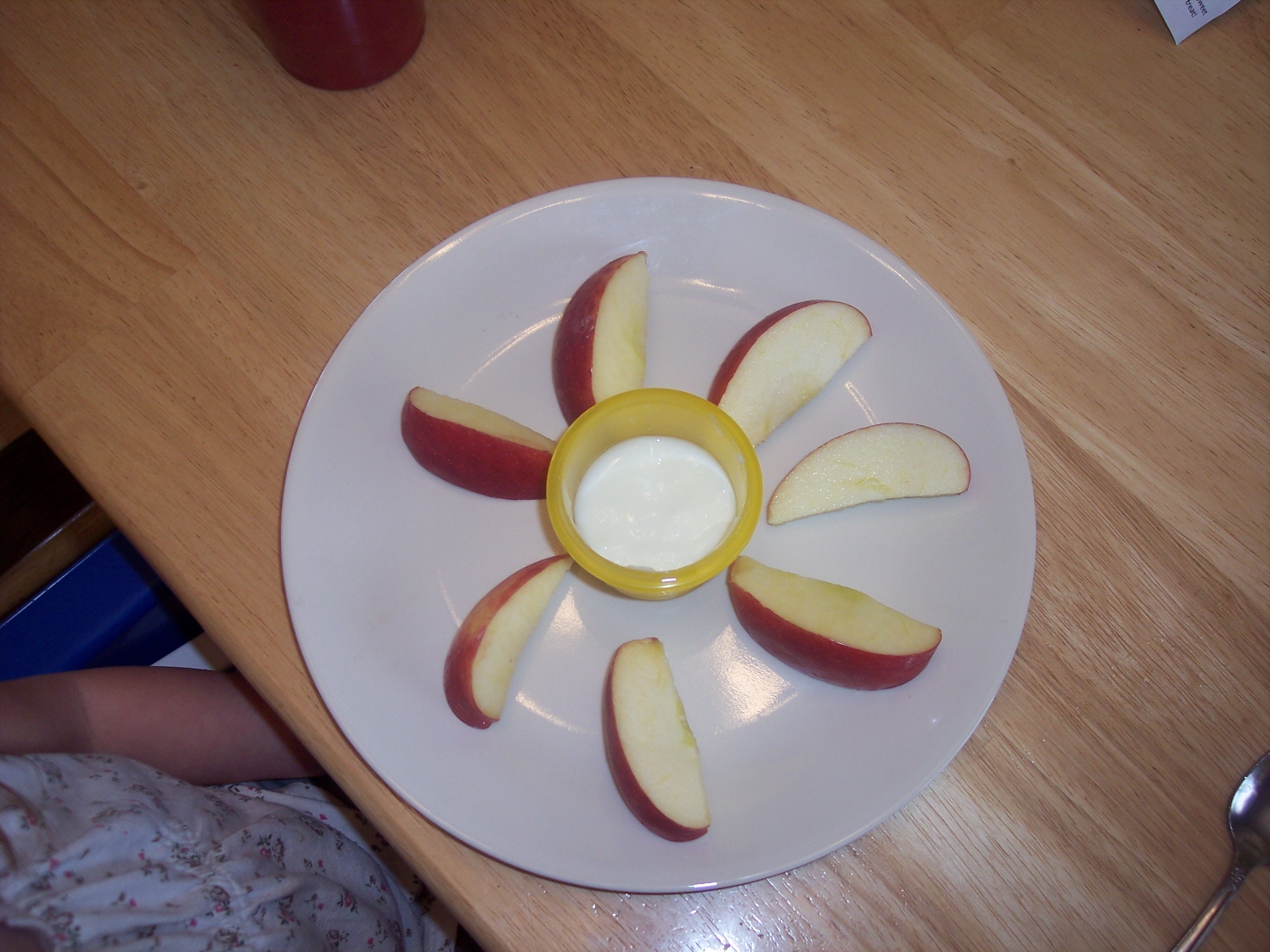 2) Arrange in a flower shape! Add yogurt or fruit dip for the middle! You could also do a grape or banana slice for the middle.