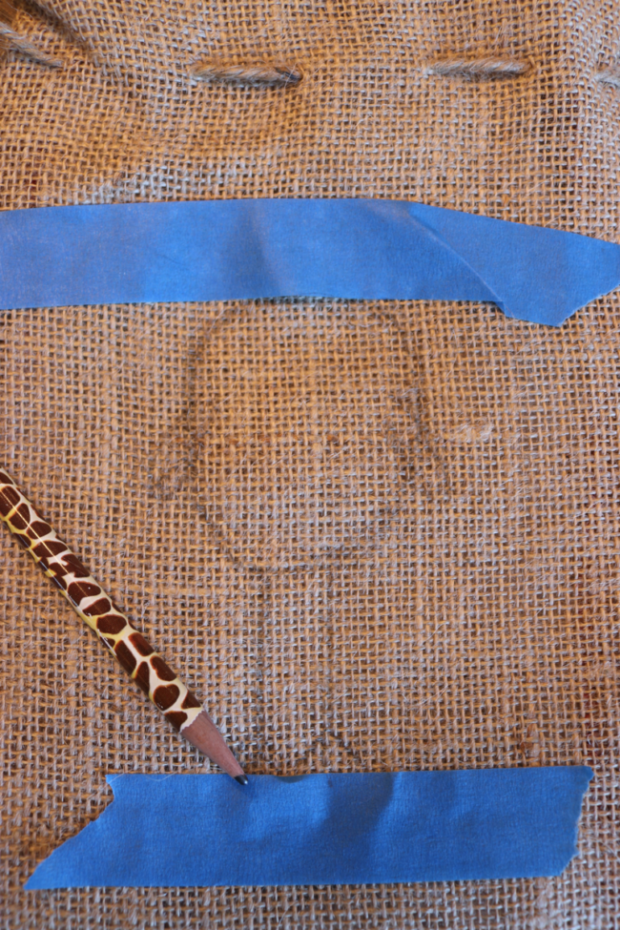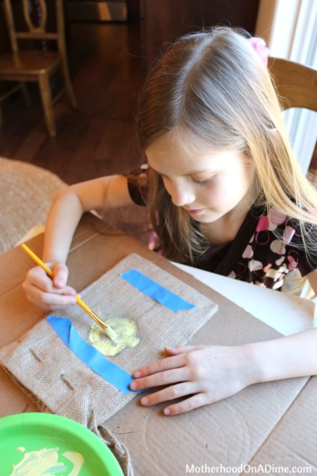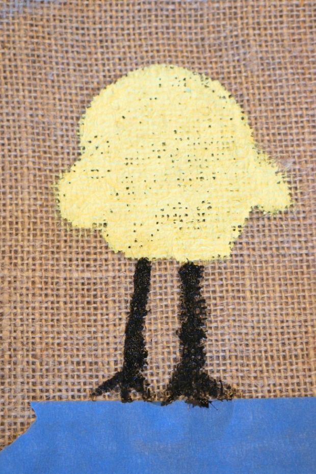 Before beginning to paint, determine the section of the burlap bag that will be visible. Put the mason jar in the burlap and with painters tape, mark the “paintable area.” This way, when your child paints the chick within the marked space, it will be completely visible with the jar in place.