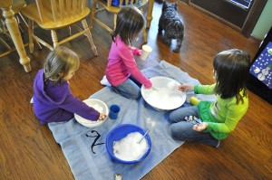 This is one of my favorite activities when it snows! My littlest girl (age 2) likes to be outside in the snow for just a little while (she’s not a fan of cold hands!), so I bring the snow inside. Simply fill up a few bowls with snow. Lay down a towel and pass out cups, measuring spoons, spatulas, and any other desired items. Have fun scooping and playing in the comfort of a warm house!