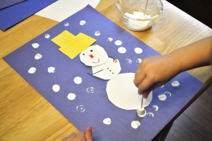 Use a marshmallow dipped in paint to add snow to a winter scene. You can find step-by-step directions here.