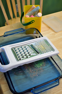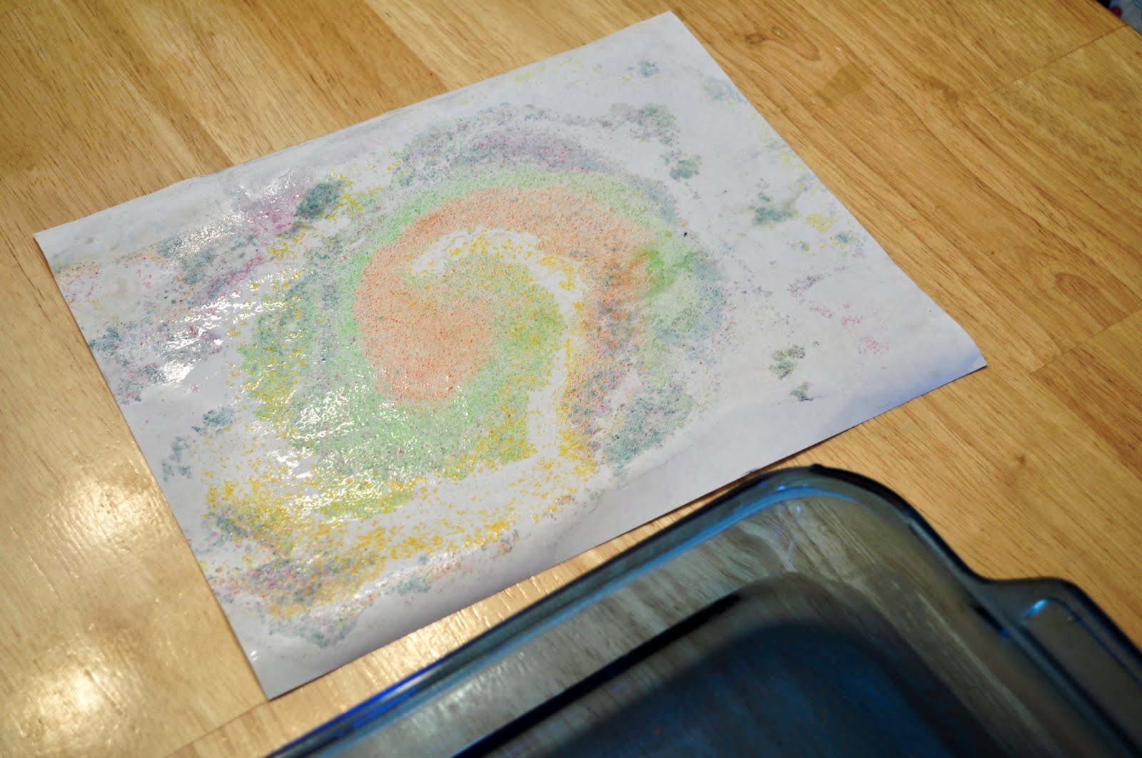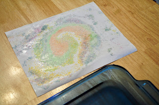 1) Fill a pan (large enough to hold a sheet of paper) with water. Grate a variety of colored-chalk into the water.