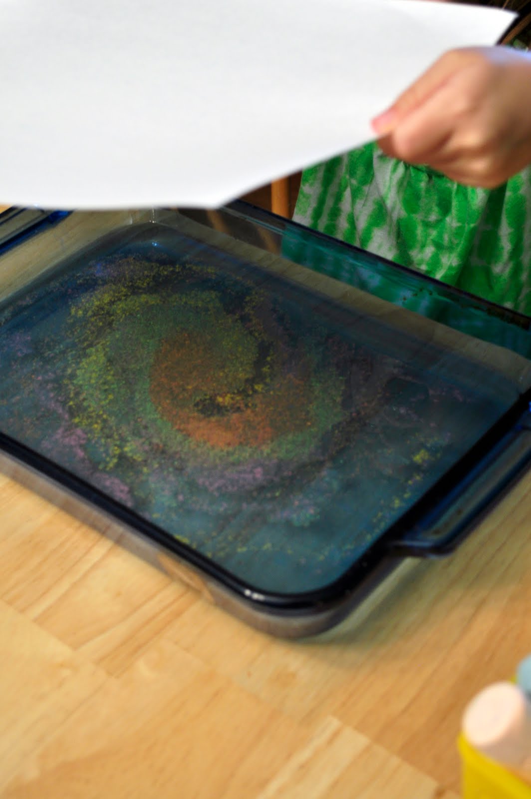 2) Allow the chalk to sit and “swirl” for a few minutes. Gently place a sheet of paper on top of the water.