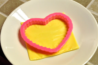 3) Use a smaller cookie cutter to cut a heart shape from the cheese, or lay the cookie cutter on the pizza and sprinkle with shredded cheese.
