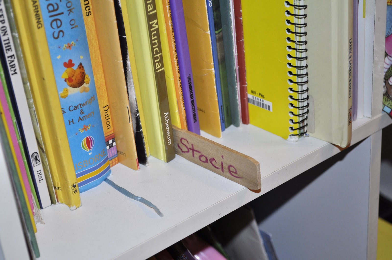 2) When your child gets a book off the shelf, they slide in the stick to mark the place where the book belongs. Once your child replaces the book, they can move the stick and pick out another book.