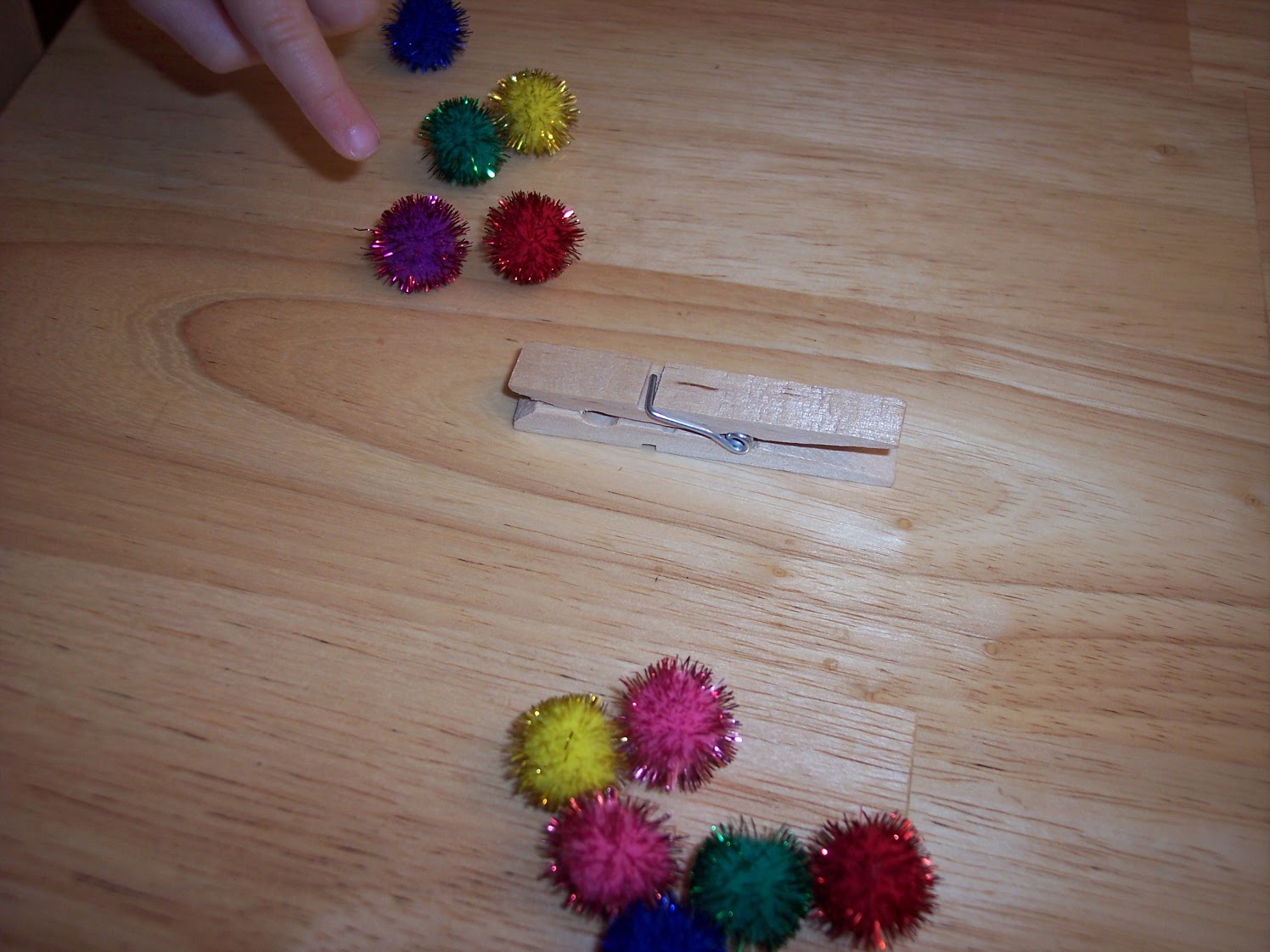 1) Glue pom poms onto a clothespin to make a caterpillar.