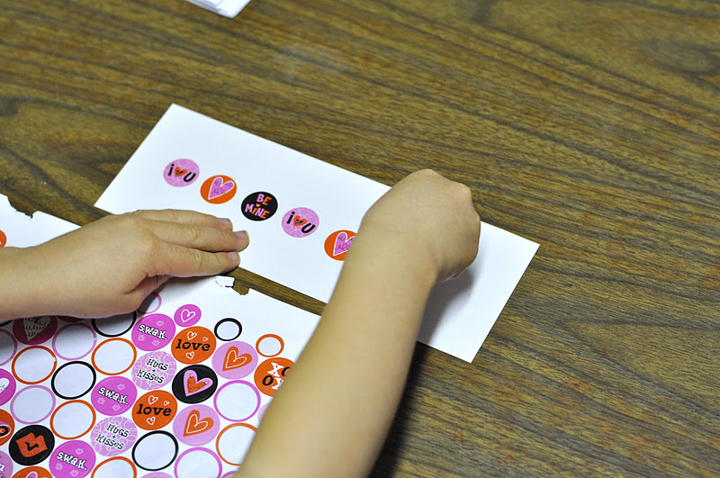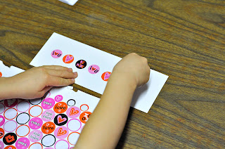 I was able to pick up a booklet of Valentine stickers pretty inexpensively several years ago at Walgreens. They worked perfectly for this patterning activity!