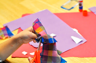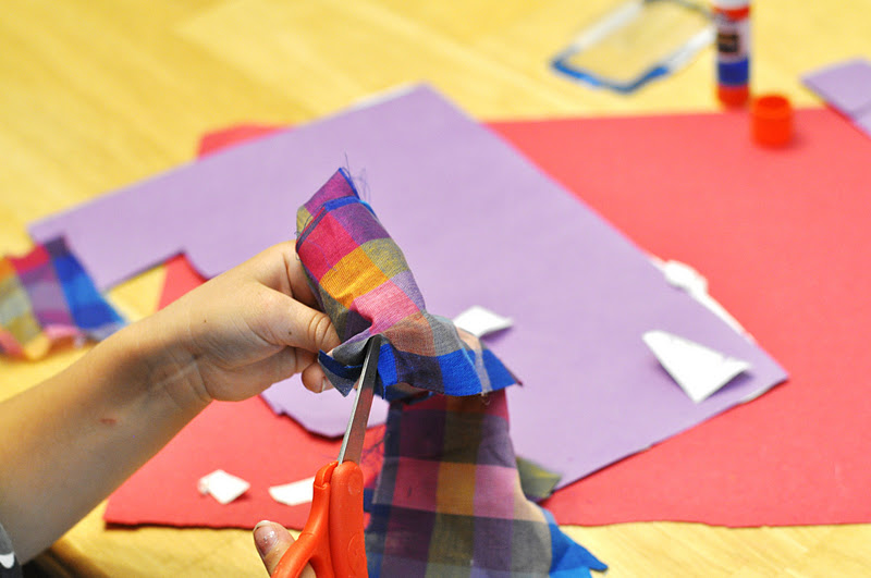 1) Discuss how to make a collage. Lay out any item you’d like to use for a collage: paper scraps, fabric, newpaper, felt, foil, etc.