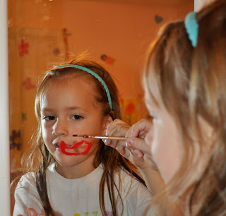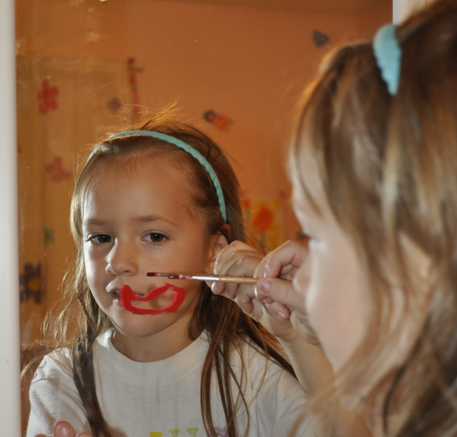 1. Stand your child in front of a mirror or place a mirror in front of them. Have your child paint herself on the mirror.