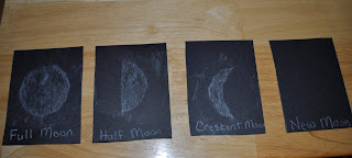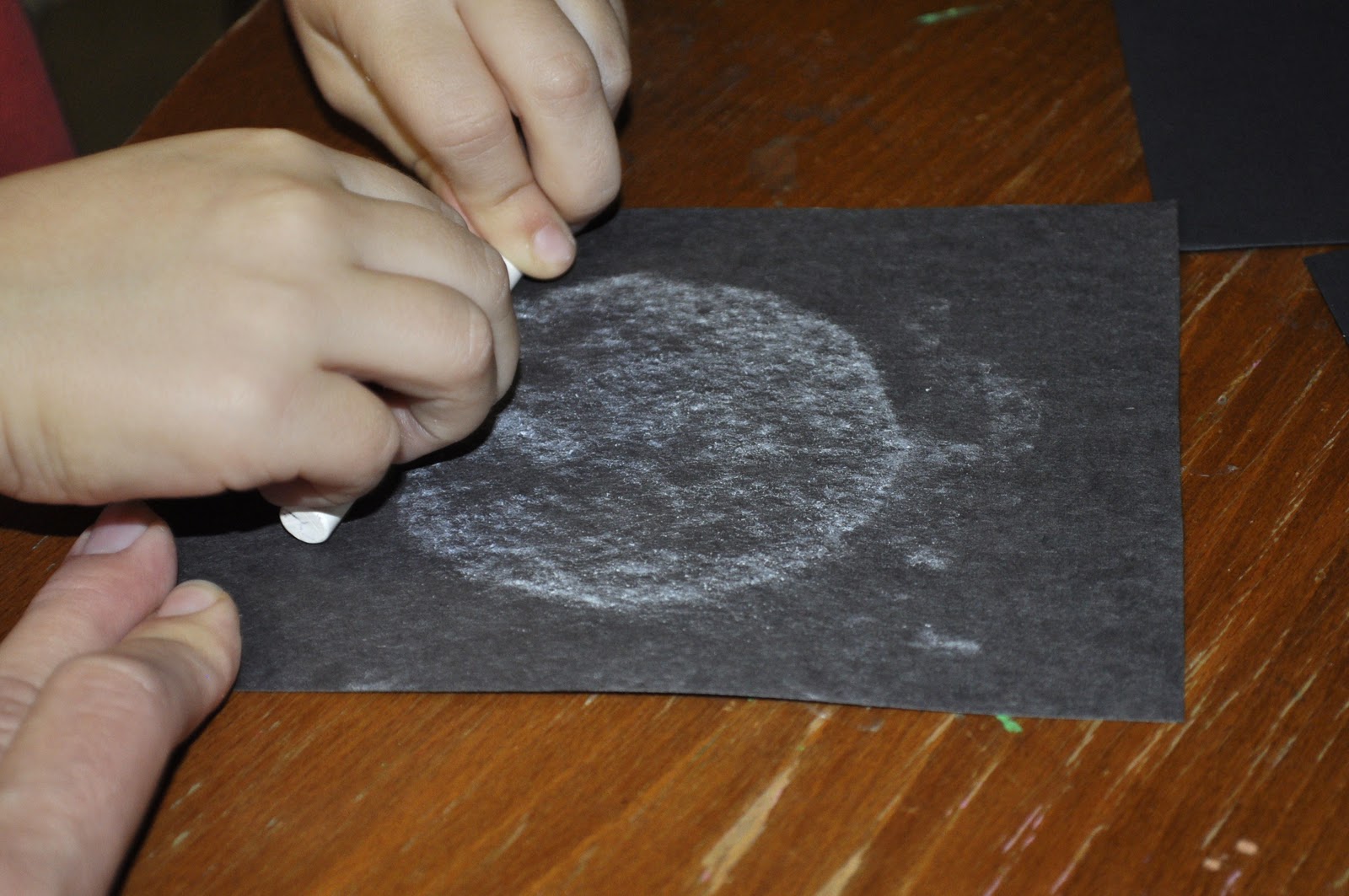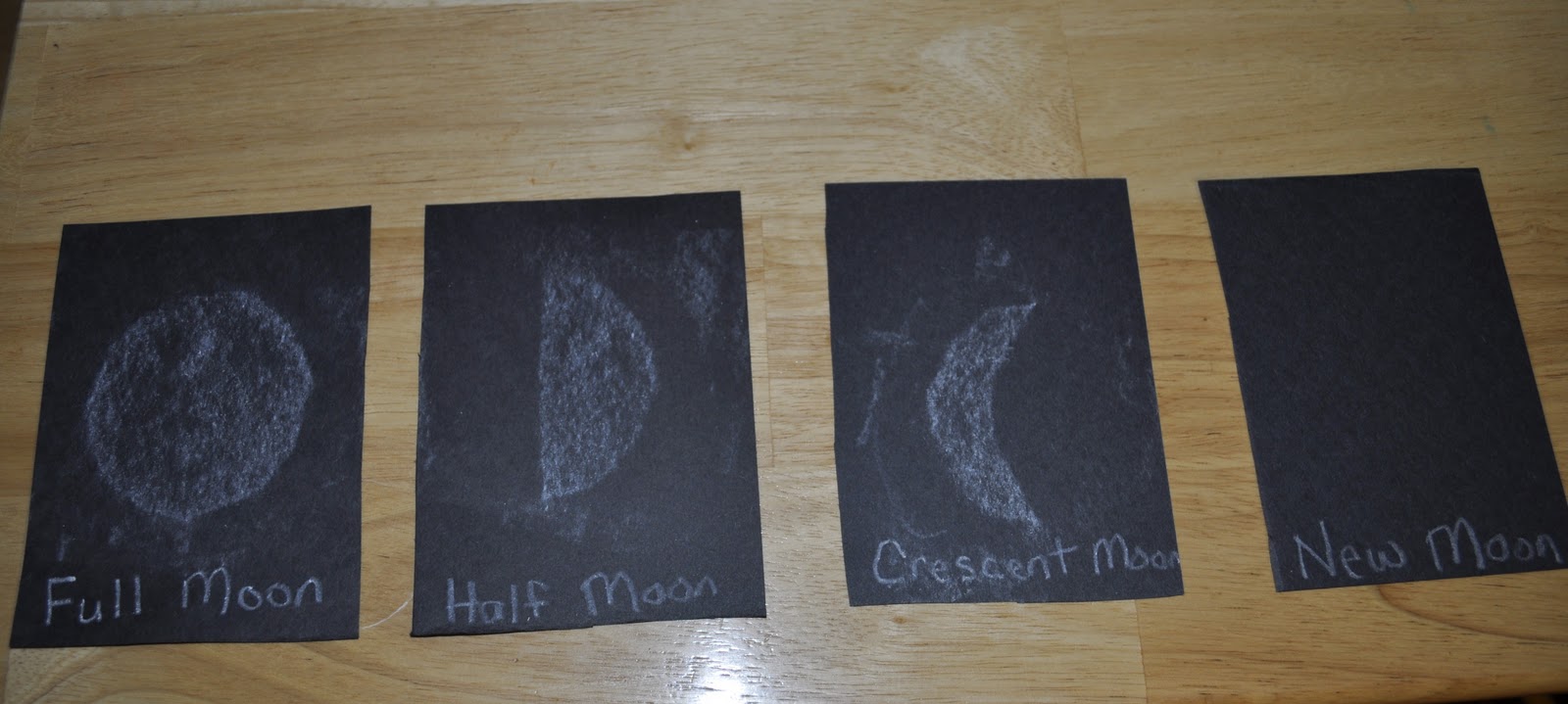 Using a very rough sandpaper creates a nice “crater” effect for the moon. After finishing the crayon rubbings, we labeled the moon phases and stapled them at the top to make a little booklet.